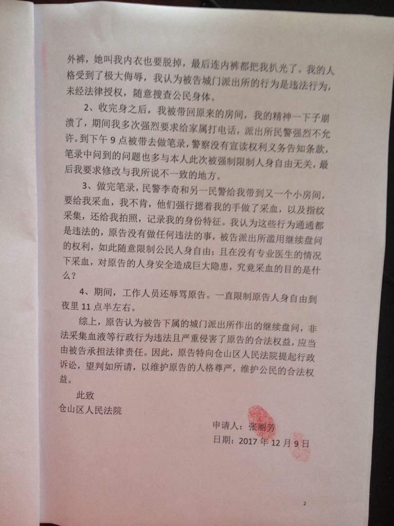 为此,张丽芳说:“我没有任何违法行为,公安在没有法律依据的情况下,滥用职权,非法限制我人身自由,侮辱我的人格,严重侵犯联合国《人权宣言》、《消除妇女一切形式歧视公约》。如果今天我不站出来讨还自己的权利,下次我是否还会遭受这样的对待?作为一个合法公民最基本的人权和自由,本该人人享有的,然而当下公权不受制约,谁都可能成为下一个受害者。为了讨还我自己的尊严和人权,必须挺身而出,对仓山分局滥用警权,坚决说不。希望社会各界能够关注支持我。”