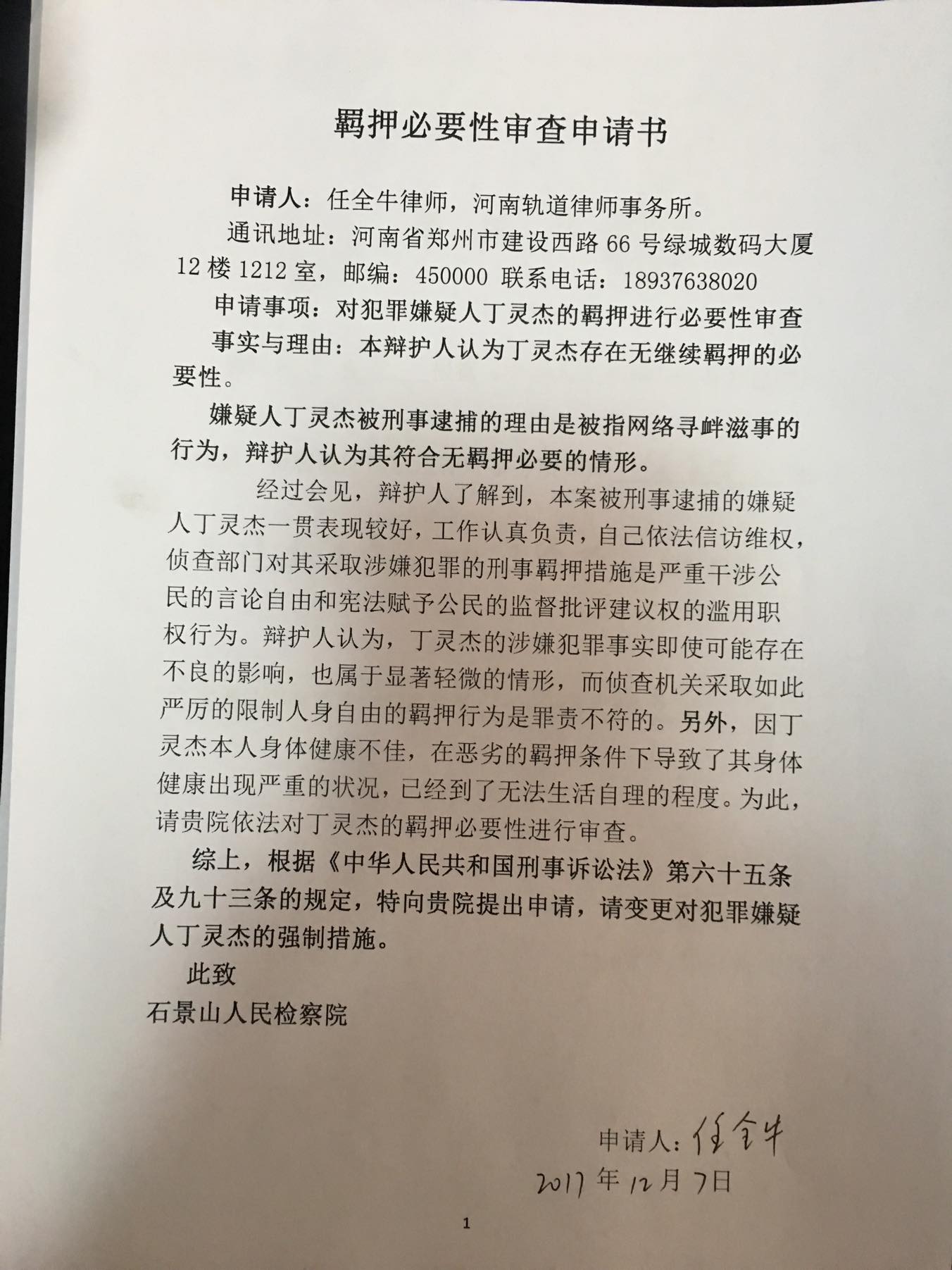 据了解,12月7日任全牛律师曾前往北京石景山看守所会见丁灵杰,发现丁灵杰在羁押期间身体健康恶化,当天任全牛律师向石景山检察院提交了《羁押必要性审查申请书》,要求变更对丁灵杰所采取的强制措施,提出申请的事实与理由为:本辩护人认为丁灵杰存在无继续羁押的必要性;嫌疑人丁灵杰被刑事逮捕的理由是被指网络寻衅滋事的行为,辩护人认为其符合无羁押必要的情形。
