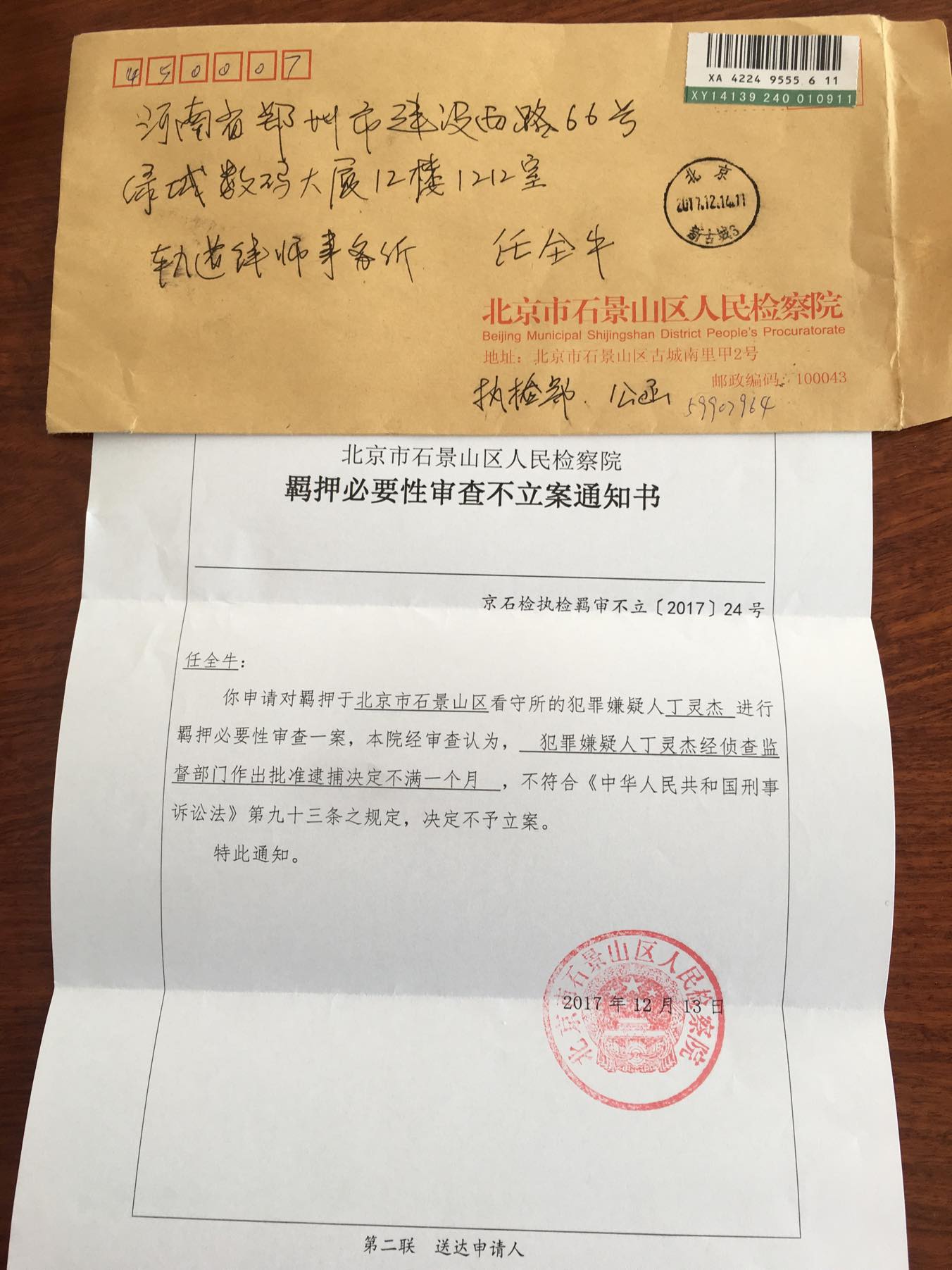【民生观察2017年12月19日消息】本网获悉,本月初代理律师任全牛为被以涉嫌“寻衅滋事罪”刑拘逮捕的民生观察公民记者丁灵杰提交了《羁押必要性审查申请书》,今天律师收到北京石景山检察院书面回复,该审查申请不予立案。