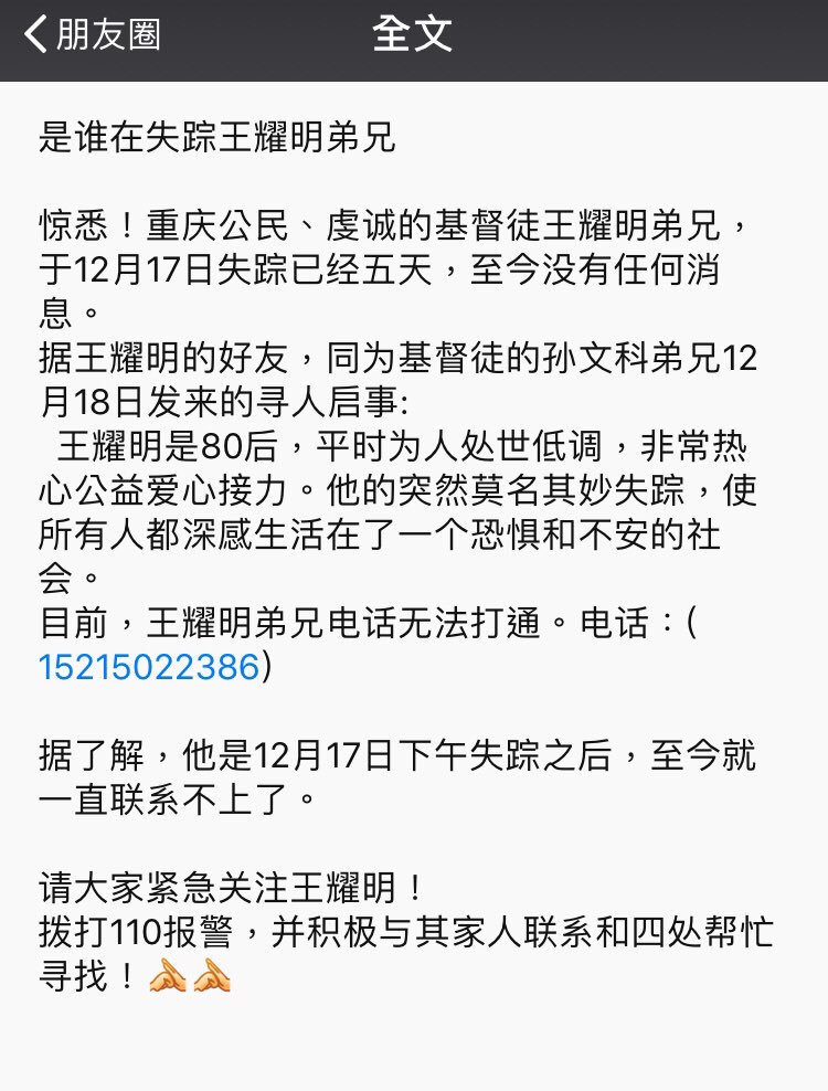与此同时,本网获悉,重庆80后基督徒王耀明在12月17日下午失联,其同为基督徒的好友孙文科曾在朋友圈发“寻人启事”找人。该“寻人启事”中表示:“王耀明是80后,平时为人处世低调,非常热心公益爱心接力。他的突然莫名其妙失踪,使所有人都深感生活在了一个恐惧不安的社会。”