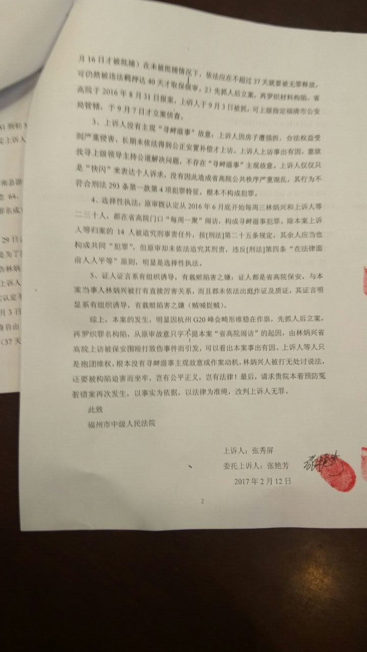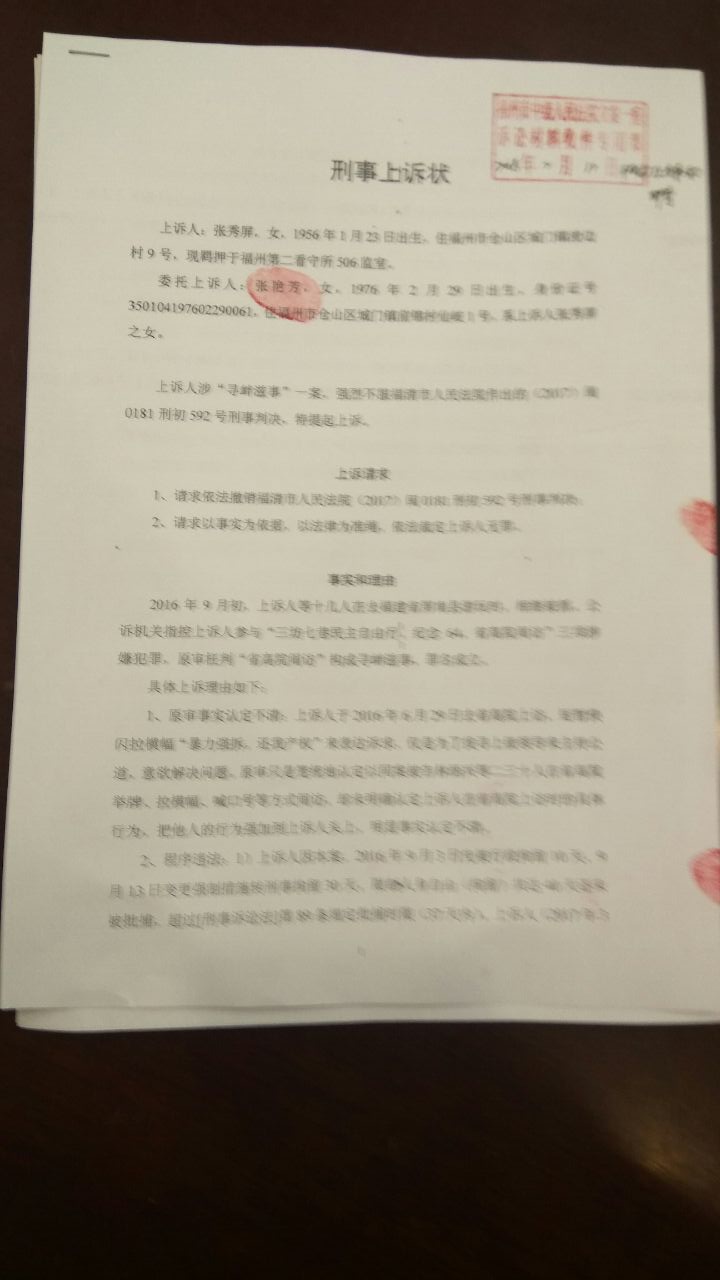 张秀屏于2018年2月6日在福清市人民法院一审就“福州大抓捕”案宣判获刑1年6个月后,当庭表示不服要上诉,并口头交代正在旁听的女儿张艳芳替她上诉。张艳芳表示,家属至今还未收到福清法院一审判决书,因为上诉期只有10天,又临近春节长假,她妈妈张秀屏是文盲不会自己写上诉状。之前张艳芳找官派指定律师帮忙上诉无果,还好从法院判决文书网得到福清法院作出的(2017)闽0181刑初592号刑事判决书,才得以及时提起上诉。