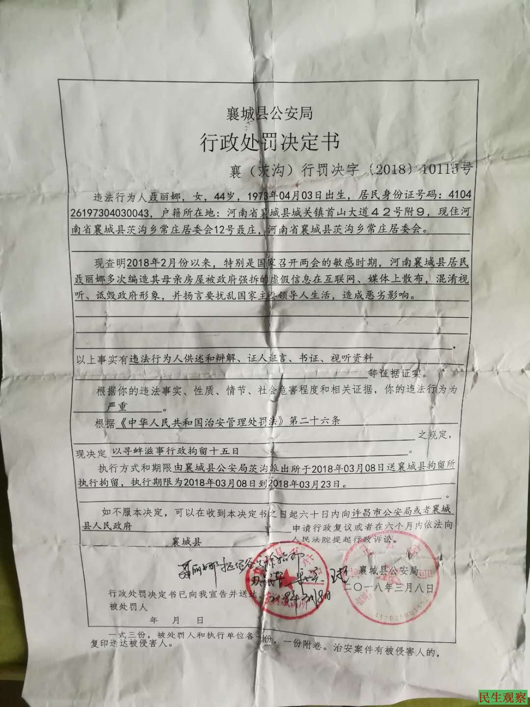 3月7日,两人被强行带回户籍地茨沟派出所审讯,之后母亲黄妙云被释放回家,而聂丽娜却于次日(3月8日)被以寻衅滋事为由行政拘留十五天,其《行政处罚决定书》中提到,现查明——聂丽娜自2018年2月份以来,特别是在国家召开两会敏感时期,多次编造其母亲房屋被政府强拆的虚假信息在互联网、媒体上散布,混淆视听、诋毁政府形象,并扬言要扰乱国家主要领导人的生活,给社会造成了恶劣影响,公安部门决定给予其行政拘留十五天。