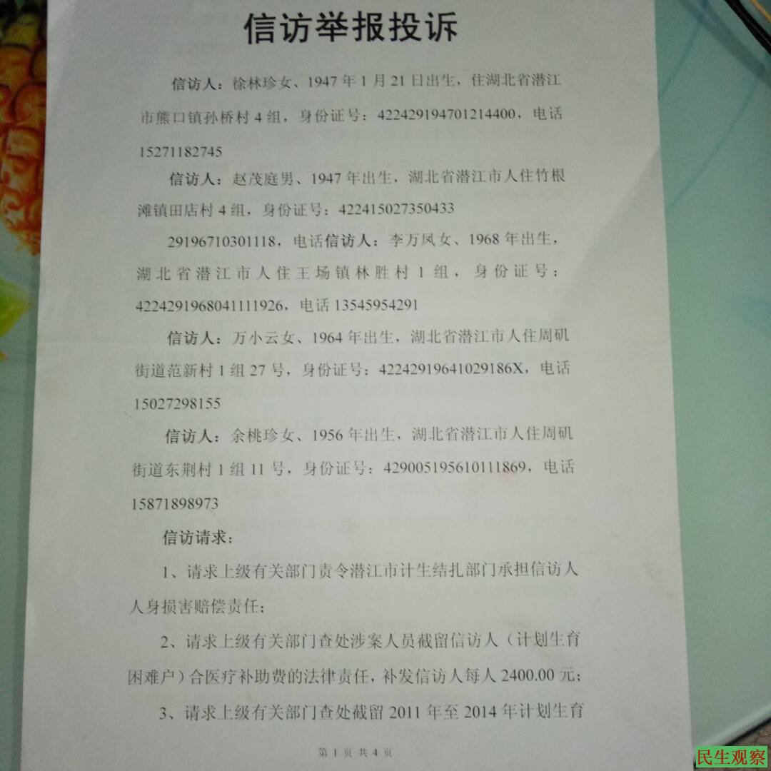 【民生观察2018年6月15日消息】本网获悉,湖北省潜江计划生育节育失败者赵茂廷、杨玉兰夫妇因上访维权多年来屡遭当局绑架、恐吓、殴打暴虐致残事件近日曝光。