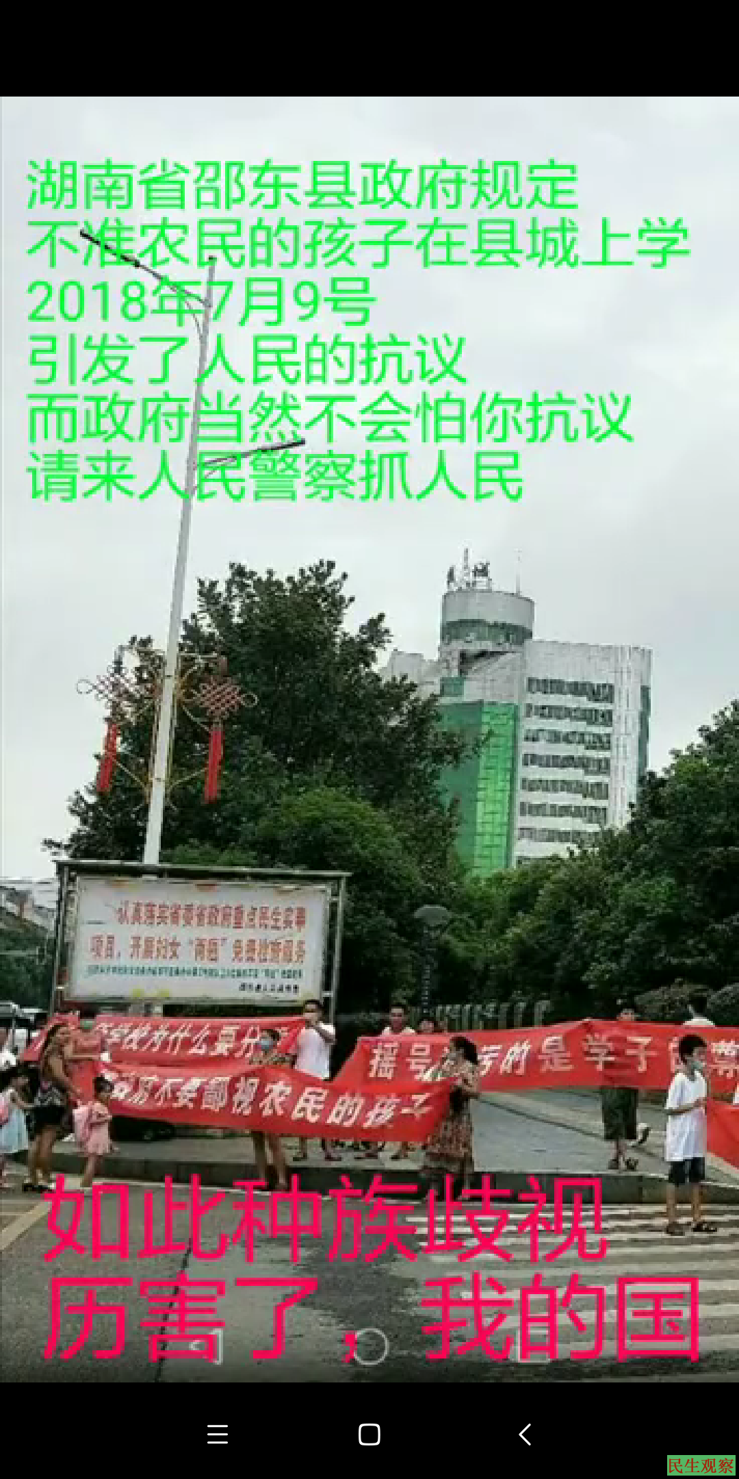【民生观察2018年7月13日消息】本网获悉,7月9日湖南省邵东县县政府门口,有大量民众和学生聚集,抗议县政府有关规定,不准农民的孩子在县城上学。