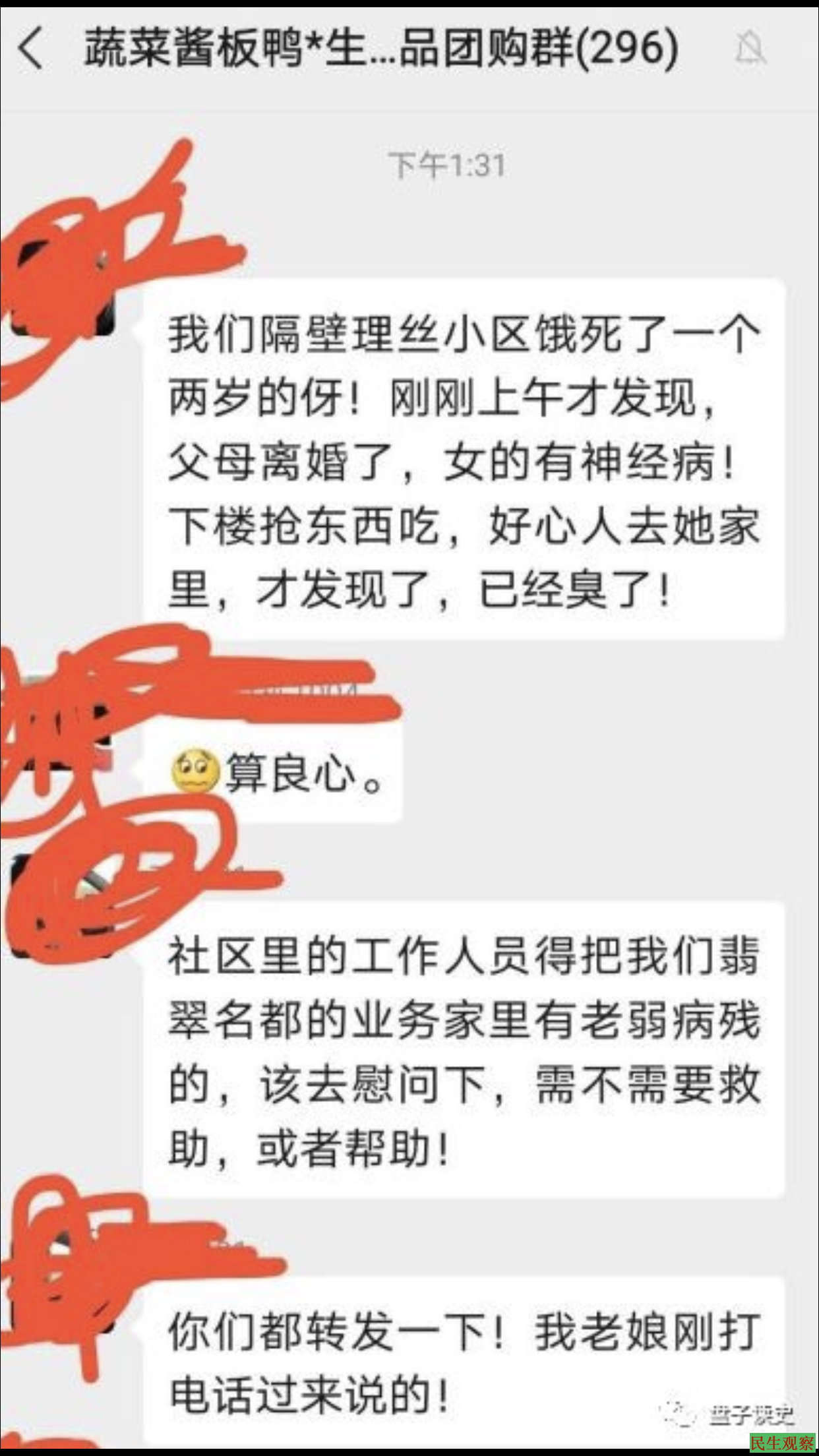 【民生观察2020年3月15日消息】本网获悉,2020年3月14日,湖北孝感市“里丝小区”一名不到2岁的幼童饿死在家中。孝感居民发帖称,孩子的父母已经离婚,孩子随母亲一起生活,母亲名叫邓陈霞(音),她精神有问题,孩子是饿死的,尸体已经发臭,警方到场后叫来了殡葬人员将尸体拖走。