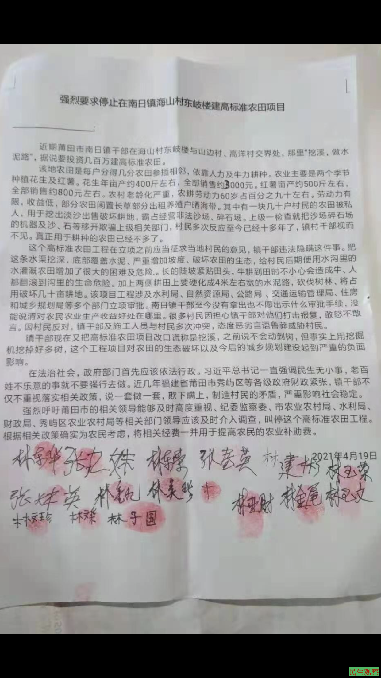 村民们请求各媒体、媒体人共同关注,强烈呼吁莆田市的相关领导能够及时高度重视,纪委监察委、市农业农村局,水利局财政局、秀屿区农业农村局等相关部门领导应该及时介入调查,并叫停这个很多农民敢怒不敢言,与现实农业生产不符,反而给当地农民带来极端不利的高标准农田工程,能切实为农民考虑,并将相关经费用于提高农民农业补助费,真正做到取之于民,用之于民!
