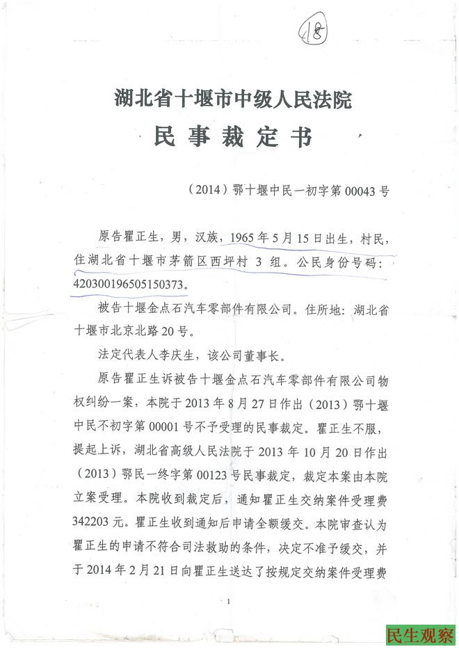 一起诉讼被求34万元诉讼费 湖北十堰农民瞿正生再提上诉