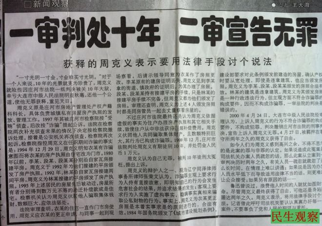 标题:《一审判处十年,二审宣告无罪——获释的周克义表示要用法律手段讨个说法》。