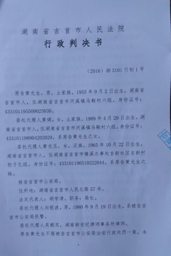 黄光生对此处罚不服,将吉首市公安局告上了法庭,案子好不容易获得了立案,今天吉首市法院对此案作出了判决。法院认为吉首市公安局处罚行为“事实清楚”“适用法律法规正确”,因此驳回了黄光生的诉讼请求。