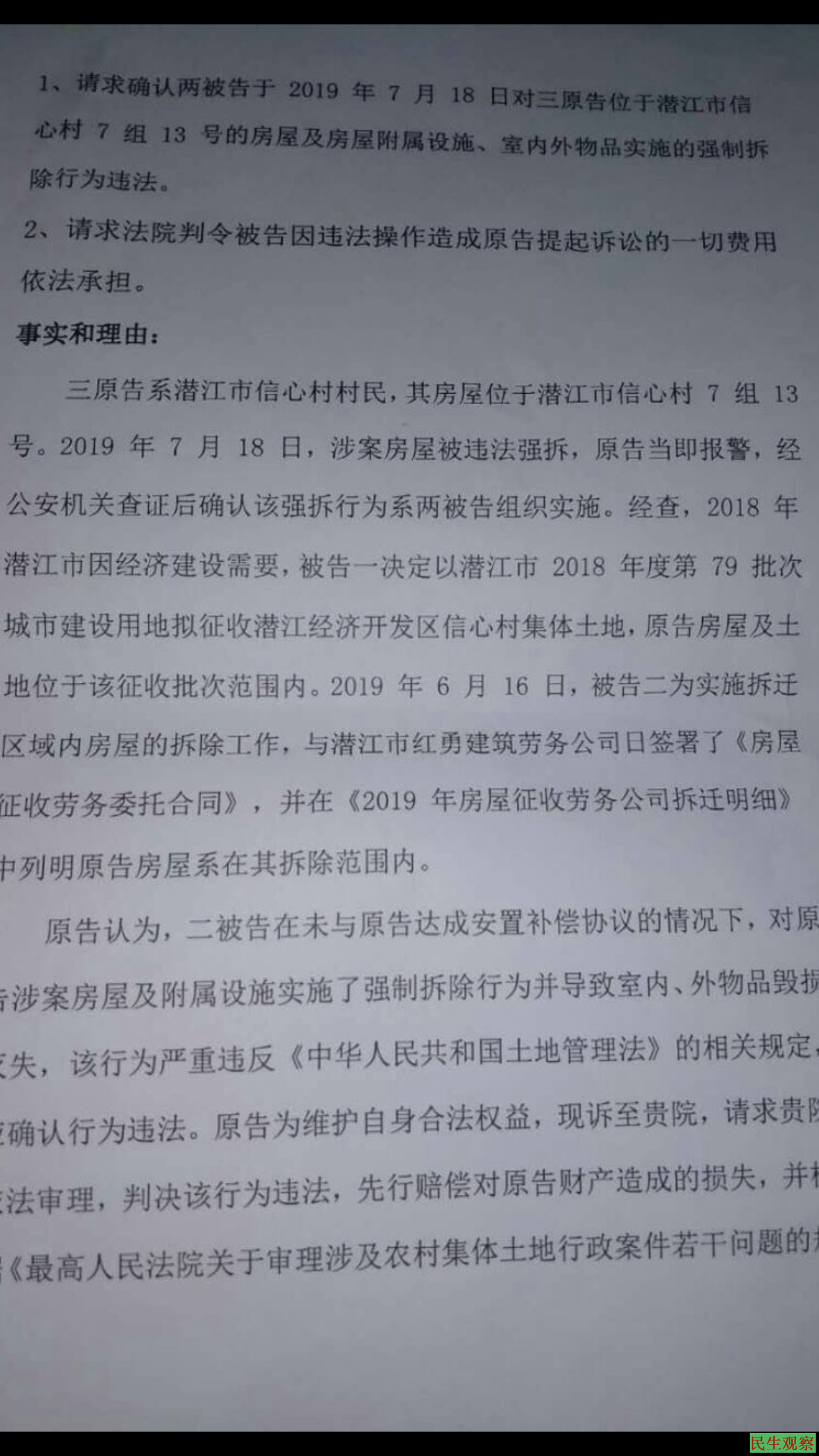 本案诉求一,请求确认两被告于2019年7月18日对三原告位于潜江市信心村7组13号的房屋及房屋附属设施,室内外物品实施的强制坼除行为违法。