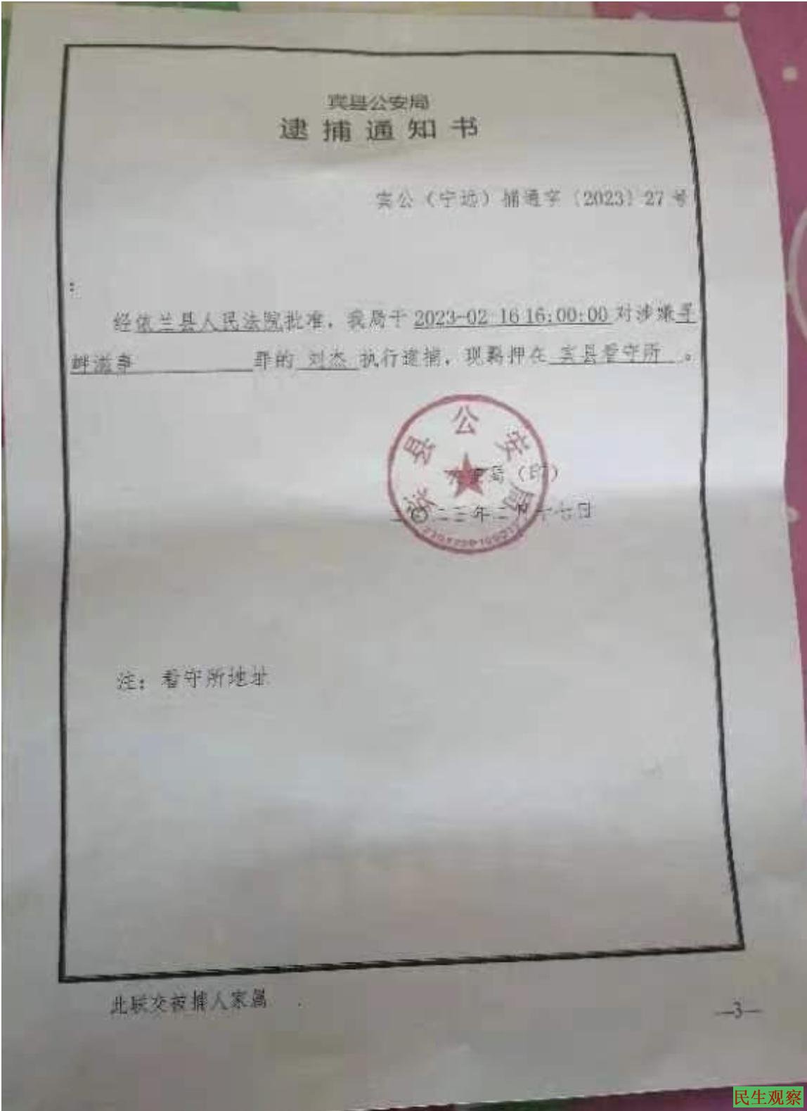 2023年2月17日上午,刘赛男在接到宁远镇派出所的电话后,随即前往该派出所,收到了宾县公安局出具的关于父亲刘杰的逮捕通知书。