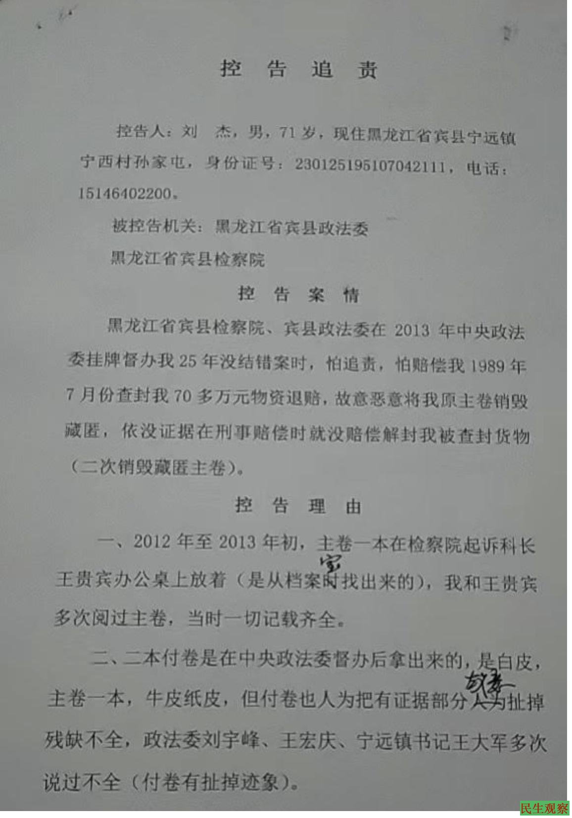 据悉,今年73岁的刘杰,是黑龙江省哈尔滨市宾县宁远镇宁西村人,早年因价值70多万元的财产被侵占而上访申诉,后被司法机关故意销毁藏匿案件卷宗,导致案件败诉。在依法追责过程中,遭到当地维稳人员打压迫害,被多次拘留、非法逮捕羁押。