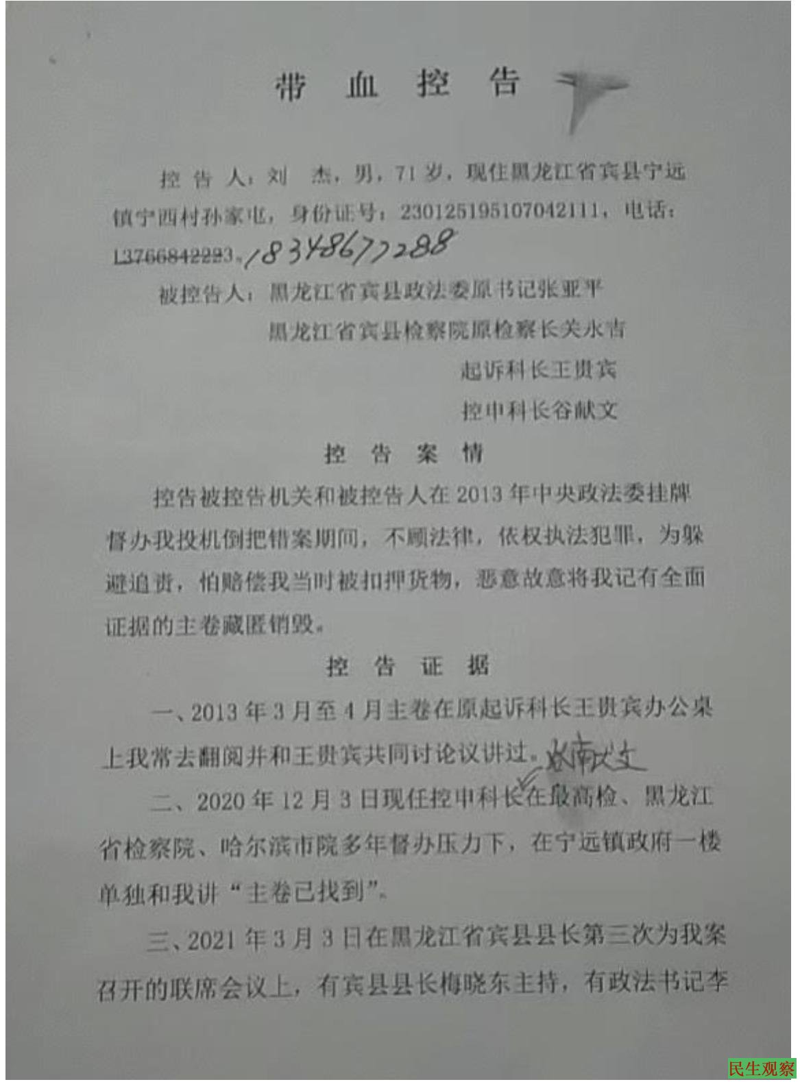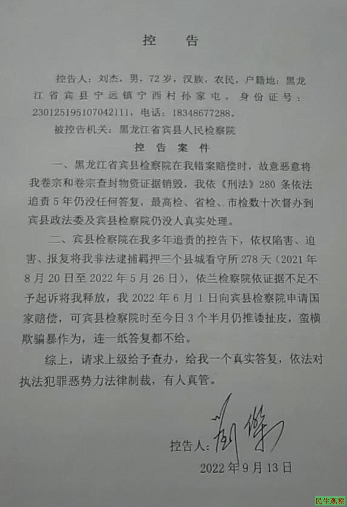 获释后,父亲刘杰不服法院的判决,遂于2022年6月1日向宾县检察院申请国家赔偿,但时至今日司法机关仍推诿扯皮,蛮横欺骗,连一纸书面答复都不给。父亲气不过,到处举报投诉。