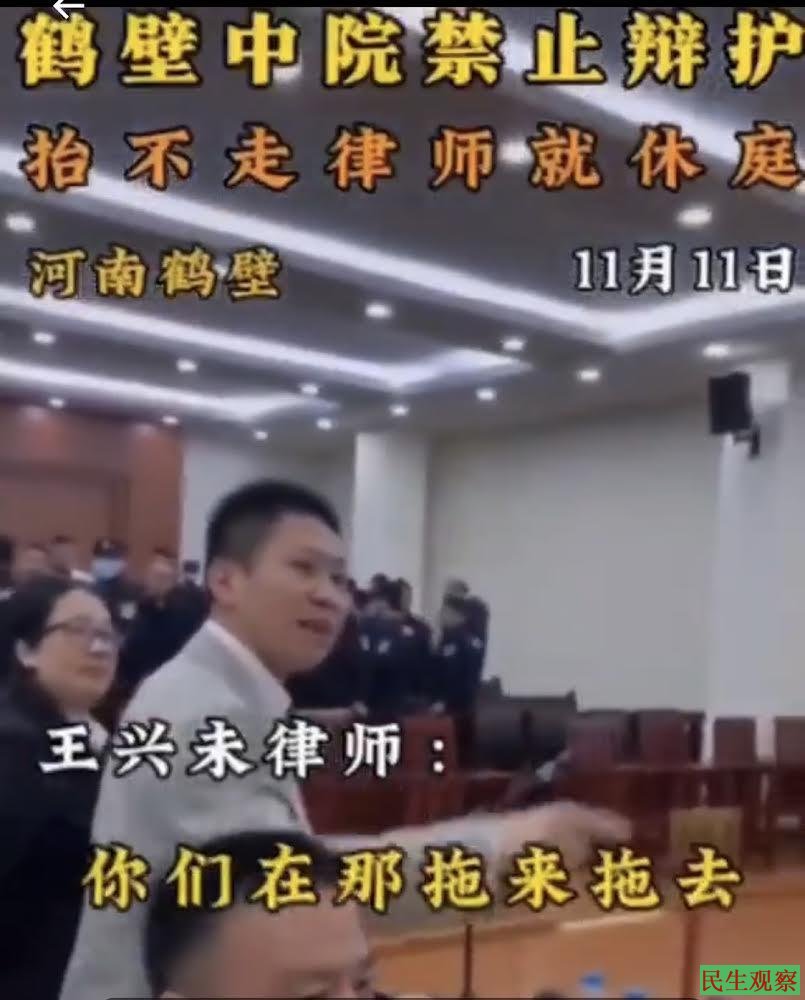 【民生观察2024年11月16日消息】2024年11月11日,在许双军涉黑案二审开庭之际,法官企图绕开辩护律师进行审判,律师杨晓、王兴未不被允许进入法庭,两人只能趁休庭间隙进入法庭,要求法官立刻停止这种非法审判行为。法官见到二人当即决定休庭,法警强制关闭所有电源,美其名曰断电维护,等待和法官理论的律师们在鹤壁中院用手机照亮法庭。11月14日早晨复庭,二人再次被拒之门外,拍摄叙述被剥夺辩护权过程时,王兴未律师被法警控制,还遭到法警假摔碰瓷,被带到派出所,晚上才被释放。