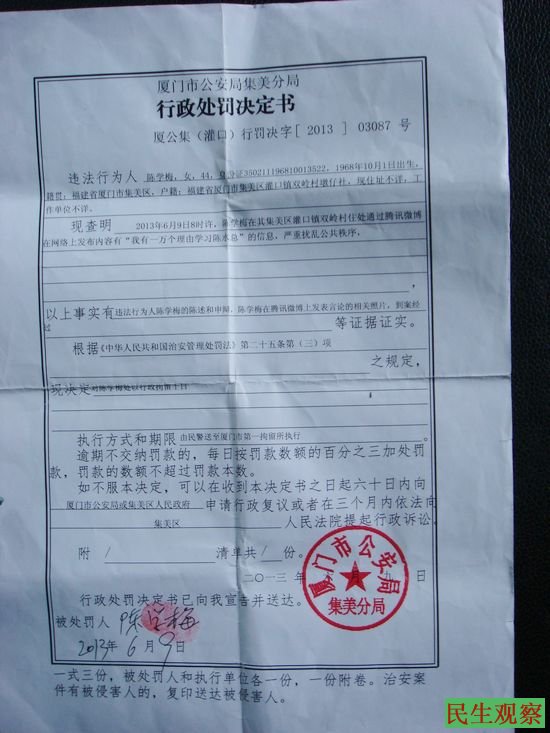 民生观察工作室2013-6-20消息:2013年6月9日,福建厦门集美区灌口镇双岭村上访维权人陈学梅被集美区公安分局拘留十天,原因是陈学梅在其腾讯微博上发了这样一句贴子“我有一万个理由学习陈水总”,严重扰乱了公共秩序。陈水总是前不久的厦门公交车纵火案的嫌疑人。