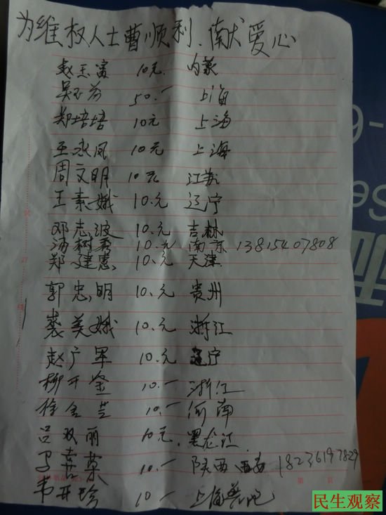 据了解,今天下午1点多钟,北京维权人士杨秋雨、江西彭中林、上海吴玉芬、郑培培、韦开珍、辽宁赵广军、王素娥、南京汤素秀等28名维权访民,到北京市朝阳区看守所为曹顺利献爱心、存款(名单附后),遭到看守所警察拒绝,说刚刚出的新规定,不给开门。下午2点后,曹顺利的代理律师王宇来约见曹顺利,并带为28名维权访民捐款给曹顺利存钱,也遭到拒绝,看守所工作人员说23日刚刚出了的新规定,隔着工作台大家看到本月23日刚刚印发的针对维权人士和访民的文件,今后访民为拘留在押的维权访民存款将被拒之门外,王宇律师在看守所接待大厅打电话与上级公安投诉、交涉一个多小时,也没有结果。