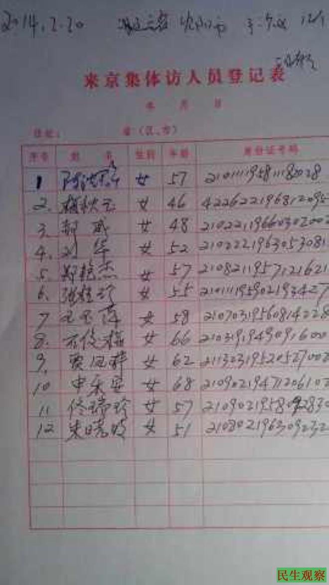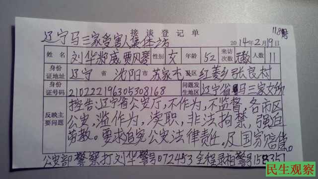 被打后,辽宁省公安厅的警察和截访人员也出现在了公安部信访大厅,并拿走了刘华等人的登记表和身份证。