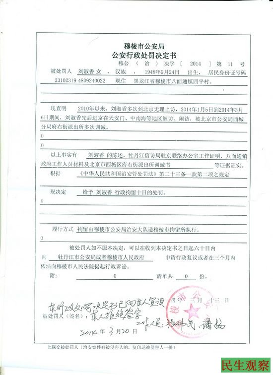 民生观察工作室2014年3月22日消息:刘淑香是来自黑龙江省穆棱市八面通镇四平村工区路8号的居民,近期因上访连续被拘留,现还在拘留所中,而就在此前的1月1日穆棱市信访干部韩有良亲书保证回家后不拘留刘淑香。