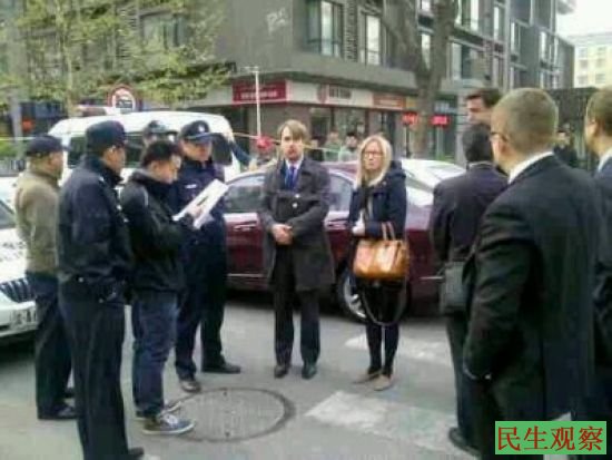 上图为:欧盟驻华使团人权官员在法庭门外遭拒