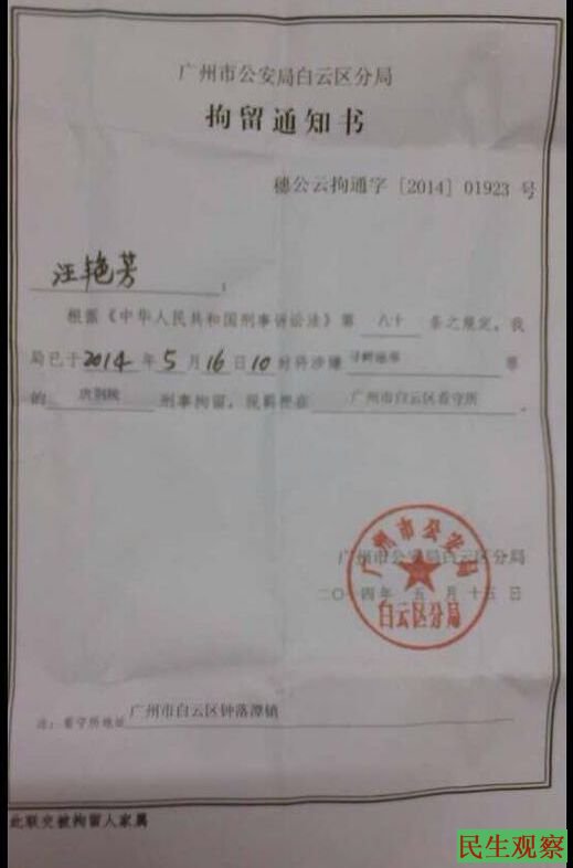 民生观察工作室2014-5-16消息:今日上午,广州人权律师唐荆陵妻子汪艳芳收到广州市公安局白云公安分局出具的通知书,通知书显示唐律师因涉嫌“寻衅滋事”被刑拘于白云区看守所。