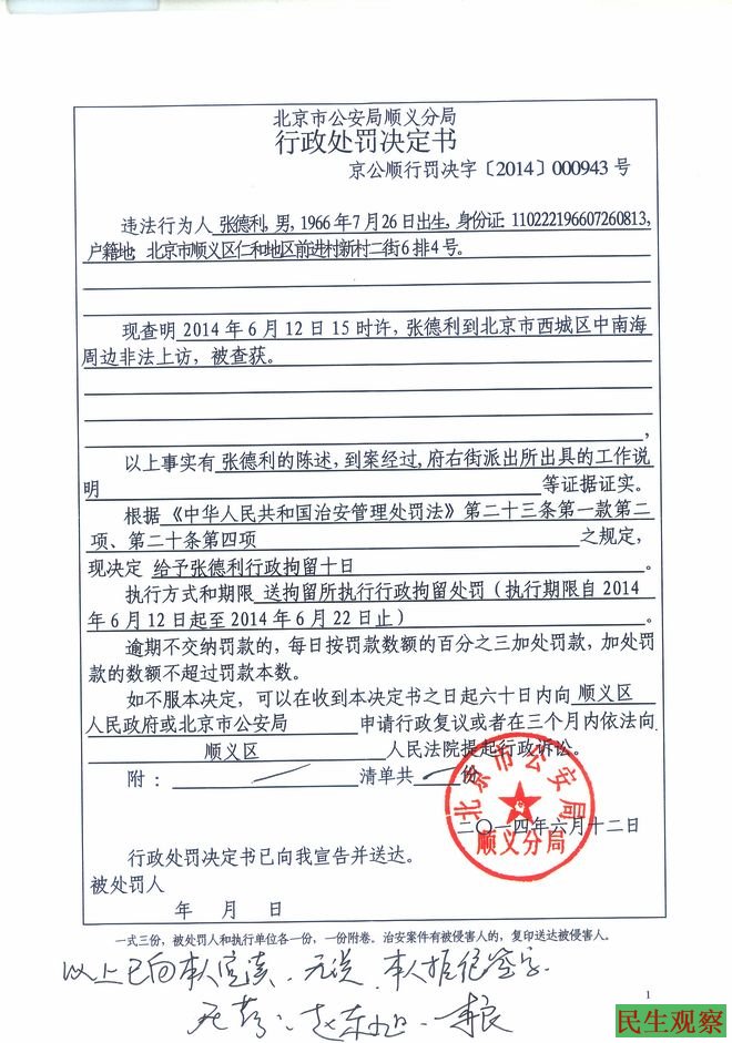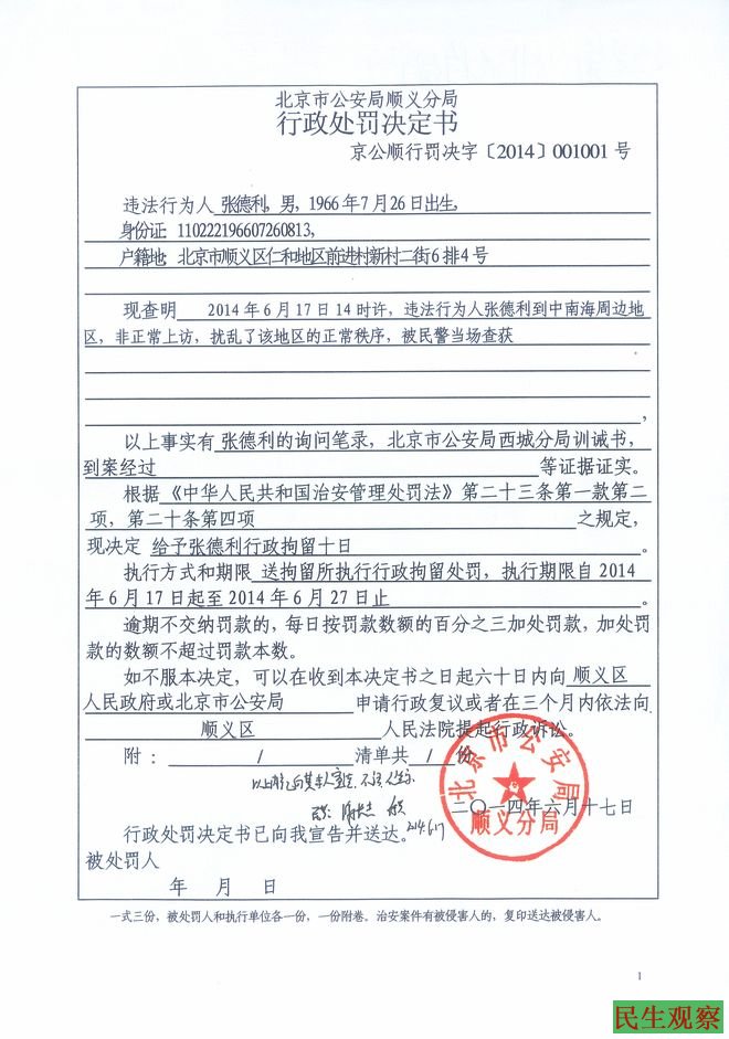 民生观察工作室2014-6-18消息:今天,北京拆迁上访人张淑凤给本工作室发来了她丈夫张德利最近二次拘留书,这已是张德利因到中南海上访第14次、15次被拘留了。