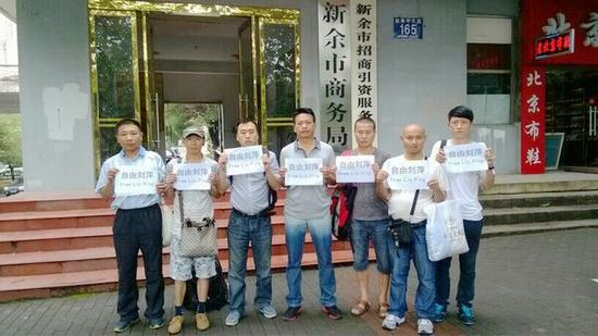 上图:左一为尹旭安在新余商务局门前举牌