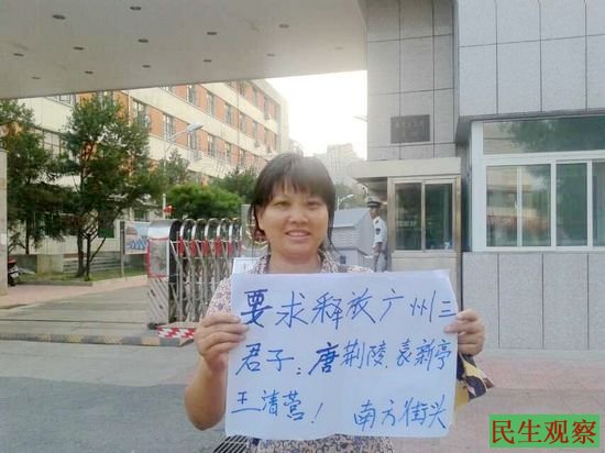 今天,马胜芬为了讨回公道以及呼吁警方释放良心维权人士,她来到了公安部门前举牌要求丰台公安局长公开财产;释放被刑拘的广东维权人士唐荆陵、王清营、袁新亭三君子。
