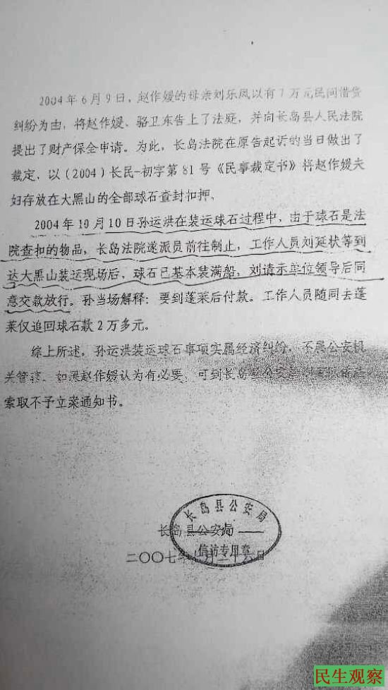 2004年10•1国庆期间,法院查封货物价值人民币约150万元,被孙运洪雇佣60多黑社会在光天化日之下,抢劫转卖,赵作媛第一时间报110,可110到场后却说你们不打出血我们不能管,你们找法院!可法院却说,货虽是法院査封的,但还是你的,抢你货你就得找公安!当我们在市.县到处报警都没人管时,只好去省府济南上告报警,法官刘延状趁机非法将装满船的抢货船只放走!当我们惊闻返回要求公安抓人时,公安却说我没权报案,只能法院移交才能受理!直到2007年赵作媛到省厅拿到介绍信时,长岛公安局却出具包庇劫匪的“没有犯罪事实”的答复意见书,60多黑社会非法抢法院不犯罪?法官非法处置查封物品不犯罪?长岛公安局凭什么以有罪为无罪?维权人骆卫东因各信访部门不作为,到中南海找清官,却被拘留,长岛政法委书记王国秋还明里暗里逼着赵作媛去非访!
