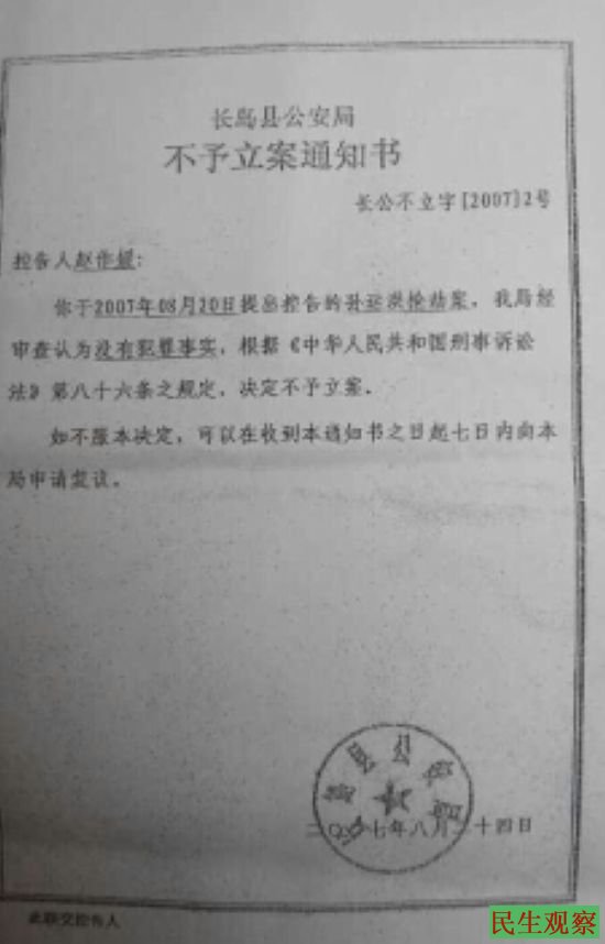刘汝力释放后依法向有关部门反映,要求长岛县公安局撤销刑事处罚,并承担对其非法拘禁、恶意伤害造成的一切损失,