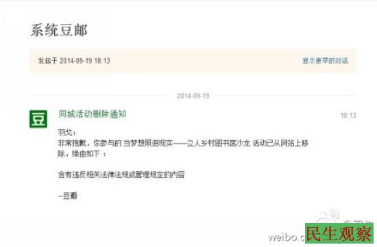 青年学者羽戈在新浪微博上说:“收到一封豆邮,经查,这是2011年5月的活动。看来,有司要清场了,但凡涉及立人,寸草不留”,理由是违反了相关法律法规。并配有一副豆瓣网发来的通知删除邮件。