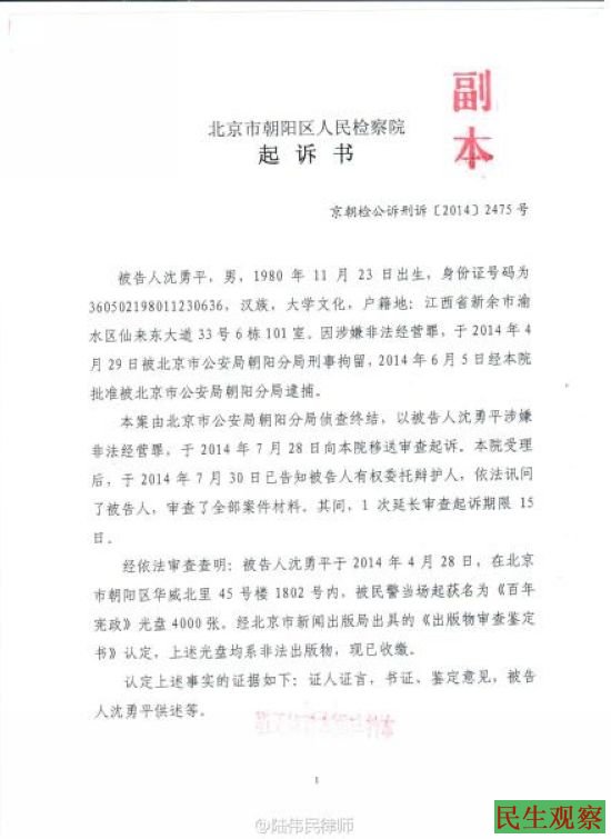 《百年宪政》导演沈勇平涉嫌”非法经营罪”11月4日开庭 |
