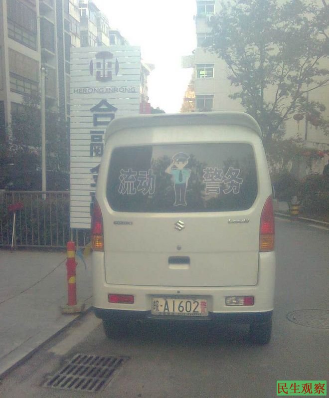 民生观察工作室2014年11月18日消息:今天上午,一直关注香港占中行动的安徽合肥民主人士沈良庆给本工作室发来消息说:今天敏感吗?上午九时许我下楼遛狗时,楼道口不仅多出无所事事的闲人,甚至公然停放一辆闪烁着警灯,牌号为皖-A1602警(红色)的流动警务车,难道住宅周边十几个摄像头还不够用?难道是香港开始清场了?