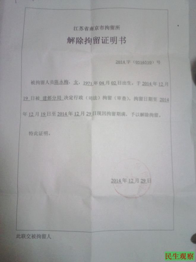 民生观察工作室2015年1月1日消息:江苏南京访民陈永梅12月18日到中南海上访被送到马家楼,地方接访人员把她绑架回地方后拘留10天。