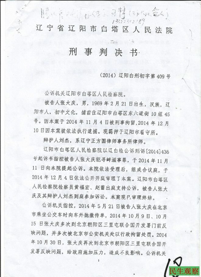 辽宁访民张大庆上访被以寻衅滋事罪判刑8个月 |