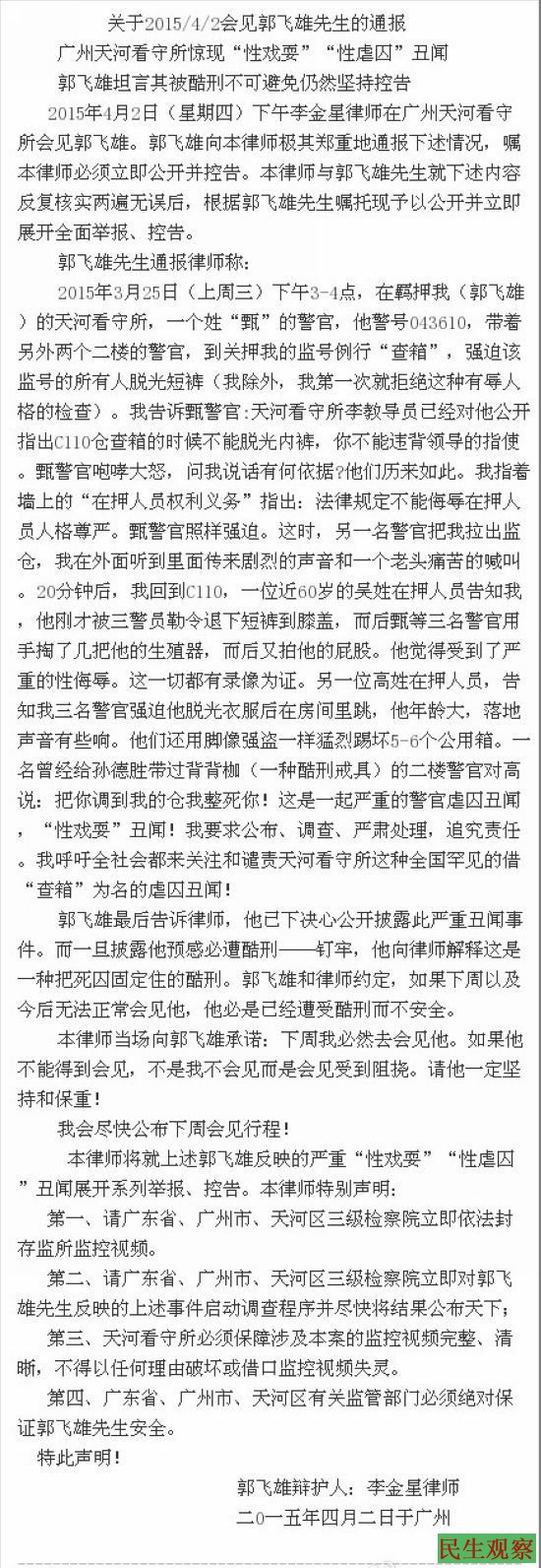 民生观察工作室2015-4-3消息:昨天(4月2日)下午,李金星律师在广州天河看守所会见了被羁押维权人士郭飞雄,郭飞雄向李律师极其郑重地通报下述情况。