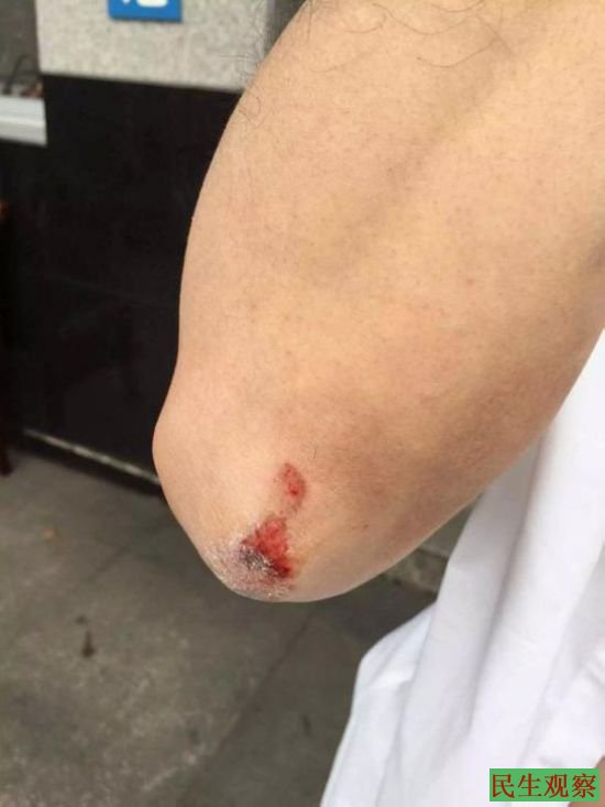 “王甫一下车就被一群人围住了,好多女的,三四十岁左右,也有男的,有的拽腿有的抱腰,然后几个撕扯他的衣服,拽头发,用指甲就这样抓脸抓身上,根本动不了。我在一旁拍照,被他们看到了,几个人冲过来抢我手机,也拽我头发,不止脖子上,我手臂上也有。”他卷起袖子,袖子也被扯烂了,手臂上面是很粗的一个红道道。看完伤情后,他给我看了他拍到的照片。有好几名群众围过来,说他们拍到了照片和录像,可以提供给我们。