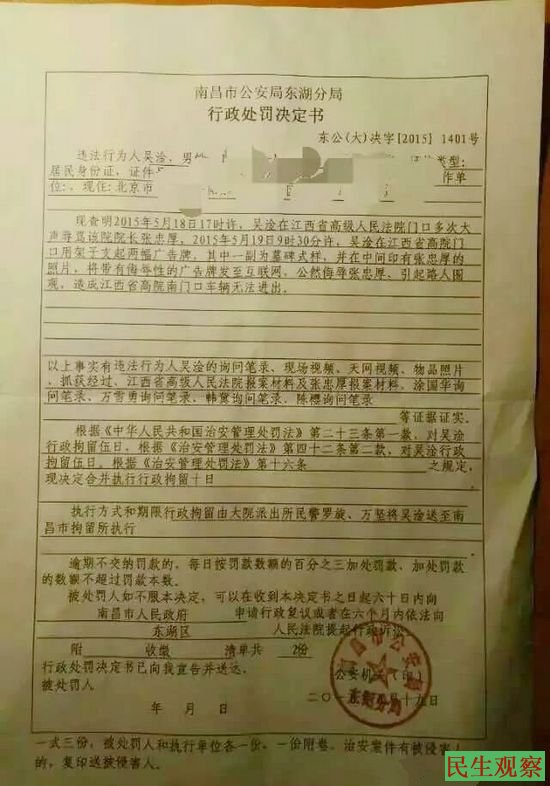 南昌市公安局东湖分局的处罚通知书称:“2015年5月18日17时许,吴淦在江西省高级人民法院门口多次大声辱骂该院院长张忠厚,2015年5月19日9时30分许,吴淦在江西省高院门口用架子支起两幅广告牌,其中一幅为墓碑式样,并在中间印有张忠厚的照片,将带有侮辱性的广告牌发至互联网,公然侮辱张忠厚,引起路人围观,造成江西省高院南门口车辆无法进出。”