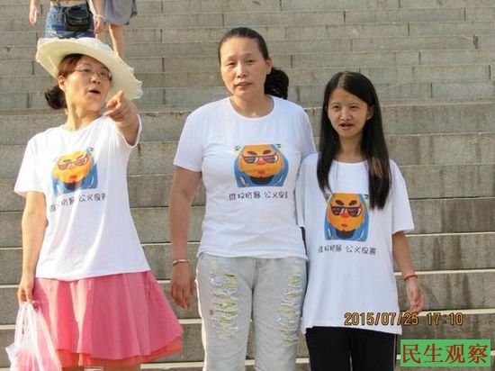 上图为:耿彩文(左一)与王芳(中)身穿印有“屠夫”头像的文化衫合影