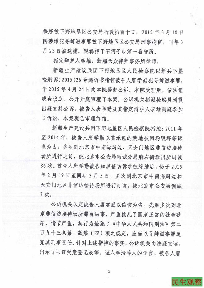 新疆兵团上访人唐学勤被判刑二年 无家可归露宿树林