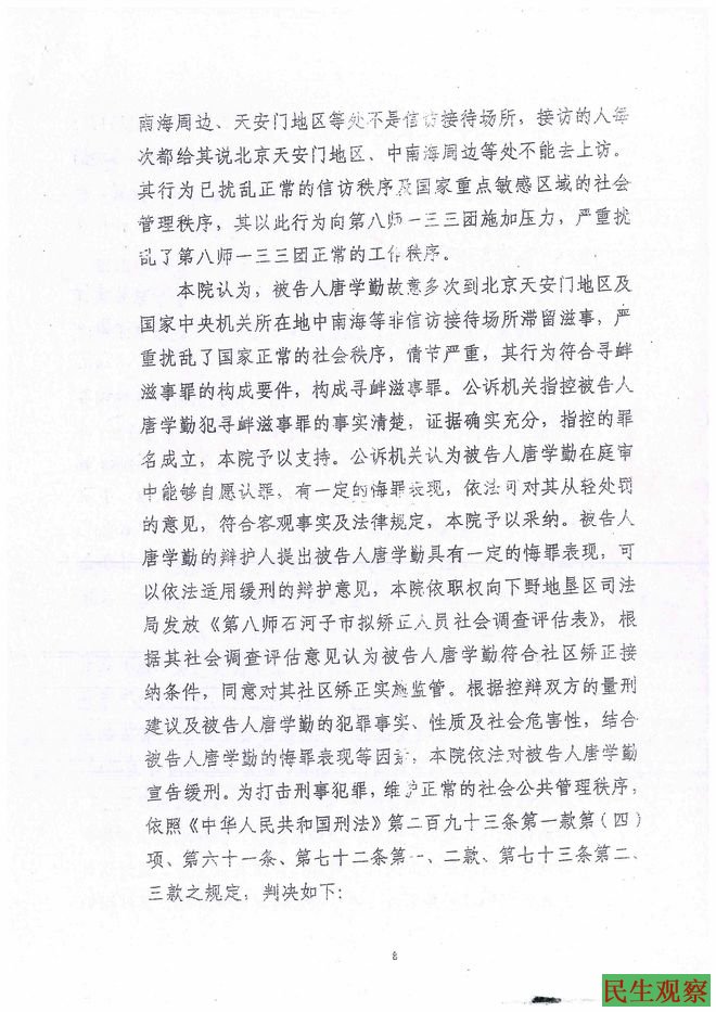 唐学勤是今天3月全国两会期间被从北京押回石河子市后,先被关黑监狱三、四个月,后于今年6月9日被新疆生产建设兵团下野地恳区法院以犯寻衅滋事罪判刑二年,缓刑四年,而判刑的依据就是这些年来唐学勤在北京上访期间,多次到天安门、中南海等地区“非正常”上访、“非法”上访。除了刑期外,法院的判决还有一条是禁止在缓刑期间唐学勤到任何非信访接待场所信访。