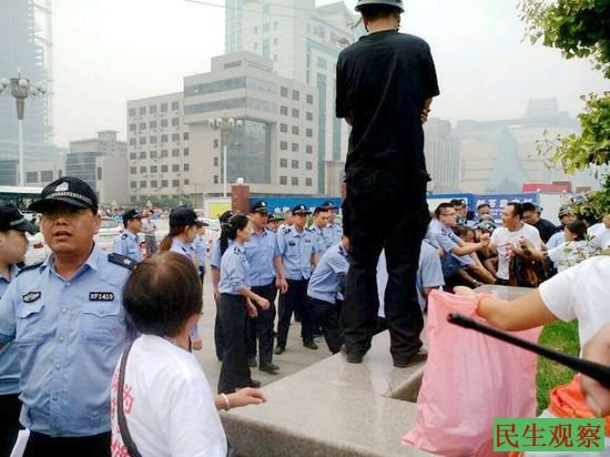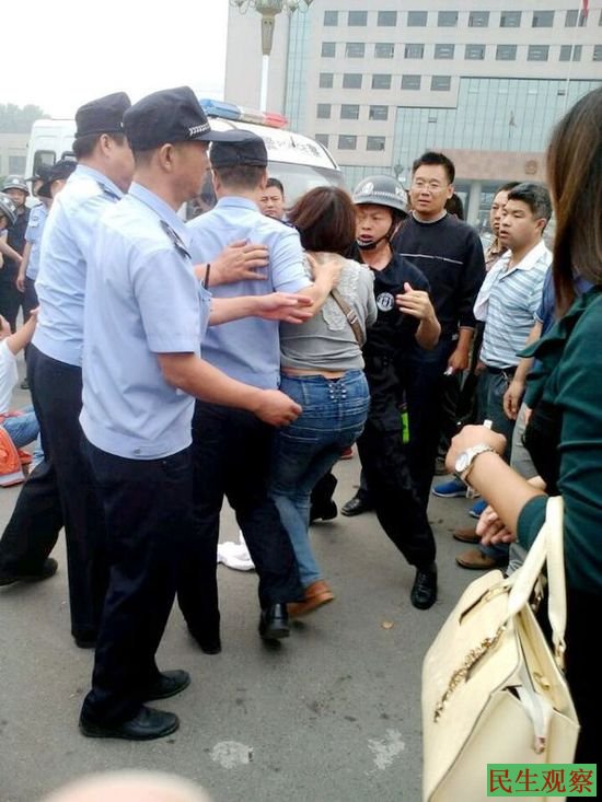 据一位业主反映,今天上午有一些业主到市政府去陈情,并且他们没有任何堵路,扰乱社会秩序等行为,纯粹是正常的合法上访。结果,这些到市政府去的业主就被一群警察殴打,期间,就连为被抓的同胞说句话都会被抓来一起殴打。有警察声称:要还手就是袭警!该业主还反映称:一位孕妇在我眼前被一个警察踹了肚子倒地,后来去了医院抢救,不知腹中胎儿能否保住?第一位业主被抓住挨打的时候有人说了一句:“你们怎么打人啊?”那警说:“来,你要不要也来喝喝茶?”然后揪出来就是一顿打。再有人拉,哪怕是说句话,都会被打。连孕妇都被踹肚子。直到最后没人敢再站出来,谁要是敢于现场录像,那么他的手机就会被砸。我被震撼了,我太气愤了。这场景只出现在抗日电视剧里,当时看电视里鬼子当着全村面强奸妇女,没人敢站出来,我气愤到家了。今天我理解了,谁出来谁死,中国人是没有凝聚力的一盘散沙。鬼子再现!孕妇坐在地上,没人敢靠近,我不知哪里来的勇气,抱着孩子冲到了孕妇身边,这时候好多男人都逃跑了,或站在远远的地方看。我对着那么多的警察说:“来抓我吧!这里打流产了,你们不管吗?”我坚定的要求他们打120。他们却开着警车带着抓了几个业主扬长而去。