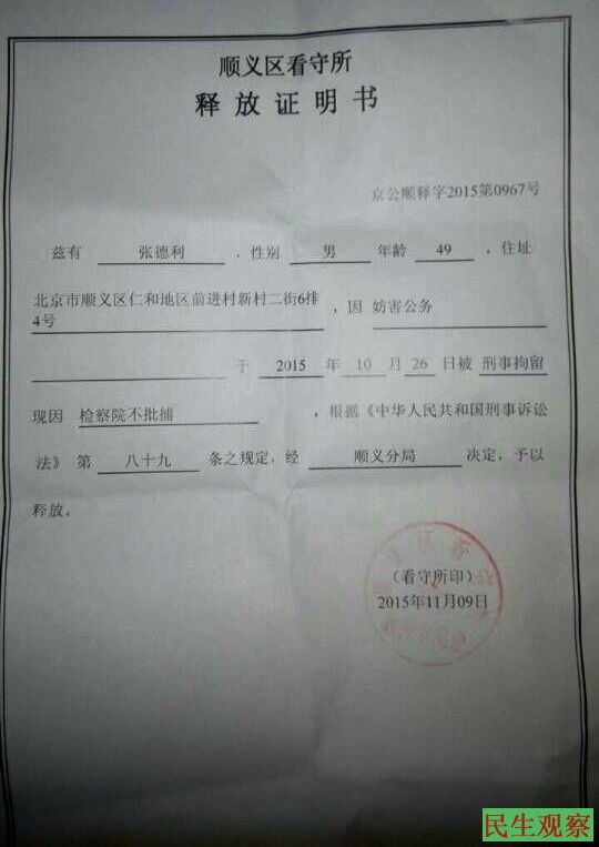 我丈夫说他们就是在谋害我,刑拘票也不给,反而给了一张順义区看守所释放证明书,因妨害公务于2015年年10月月26日被刑事拘留,现因检察院不批捕,经順义分局决定,予以释放。这都是释放证明书上写的。
