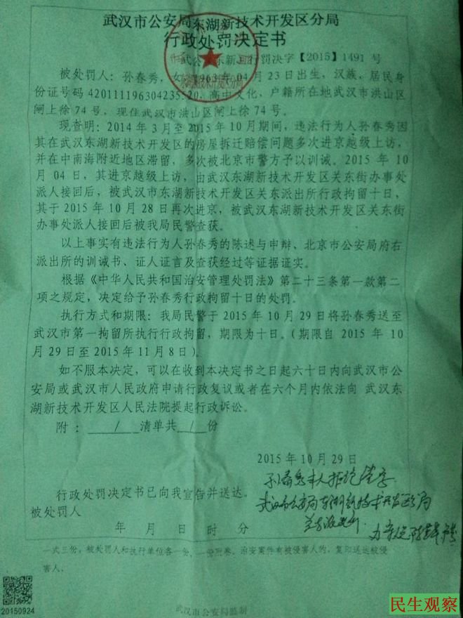 出狱后的10月28日,孙春秀再次进京上访,结果29日押回来后再次被拘留十天,最近才刚刚出来。