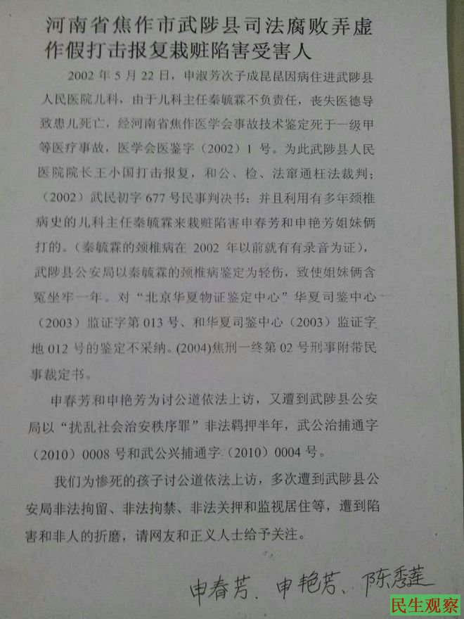 据悉,申春芳母女是因为2002年一起家人的医疗纠纷,医院勾结法院枉法裁判而上访的。