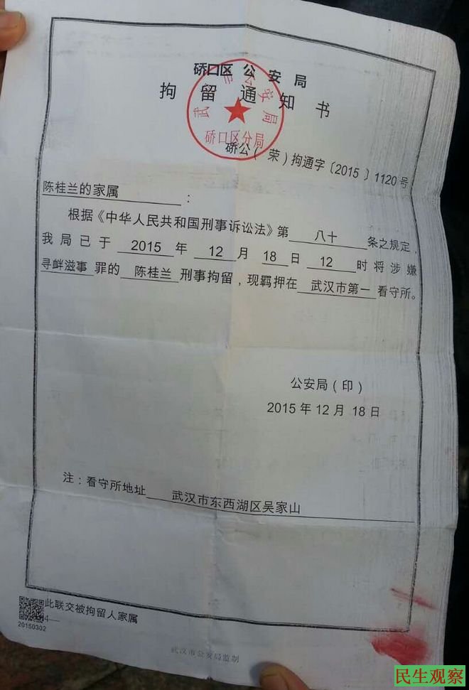 民生观察工作室2015/12/27消息:湖北武汉市硚口区16名被拆迁户12月16日在天安门自焚,十三人被以涉嫌“寻衅滋事罪”刑拘, 二人被送医院。