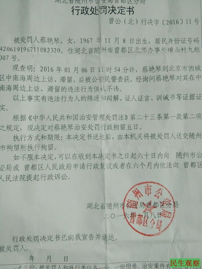 民生观察工作室2016/1/11消息:蔡艳琴是湖北省随州市曾都区北郊办事处磙山九组村民,因土地承包纠纷而上访,本工作室去年11月曾发布过她家的诉求书(湖北省随州市三居民李冬琴、余文艳、徐正义的诉求书