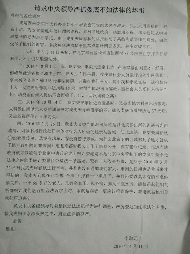 刘双元说,今年2月26日全国两会前,正在家中的周春秋突然被抓走,并被逮捕,关进了娄底市看守所。娄底市娄星区公安分局的逮捕通知书指,周春秋涉嫌所谓“寻衅滋事罪”,无非是指周春秋非法上访什么的。3月22日,周春秋案迅速开庭,但家人未获通知,未当庭判决。