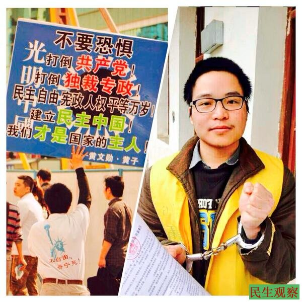 黄文勋,男,汉族,1990年生于广东惠州博罗县,几年前开始频繁参加民运维权活动一线抗争,2012年三月份在广州街头举牌要求官员公布财产,被刑拘一个月后取保候审。2013年在深圳华强北手持标语游行,由于标语内容非常激烈,在当时引起巨大轰动,此次被抓后由于激烈反抗遭到殴打,并被关押十几天。2013年四月份开始发起“光明中国行”活动,从广东一路北上,经过江西、江苏、浙江、上海、湖北等多个省市,在各地通过举牌、游行示威、发传单、网上呼吁等方式宣传宪政民主、呼吁广大同胞积极参与抗争,此次活动在民运圈引起轰动,得到多人响应。几年间黄文勋还参与很多次抗争活动,这里无法一一赘述。