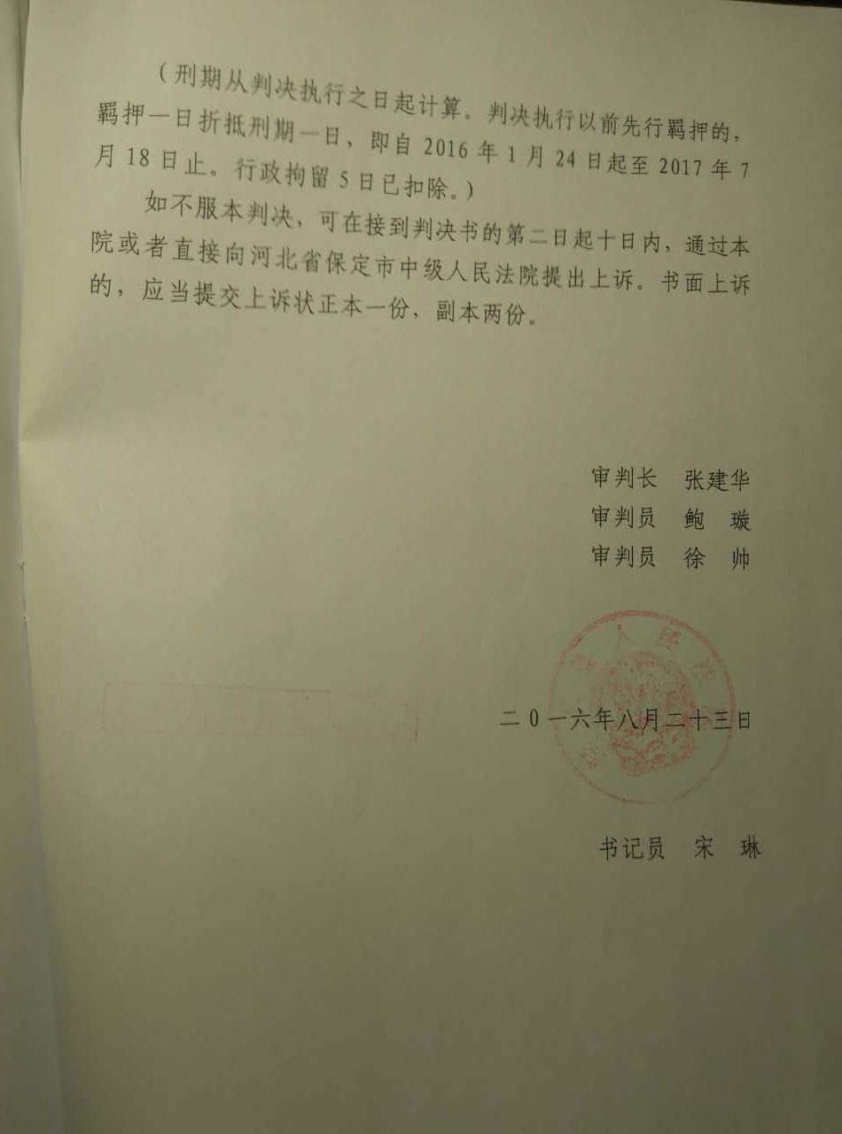 民生观察工作室2016/8/27消息:昨天,李威达律师收到了河北保定涞水县访民李桂芝因上访被寻衅滋事一案的判决书,涞水县法院一审判处李桂芝有期徒刑1年6个月。