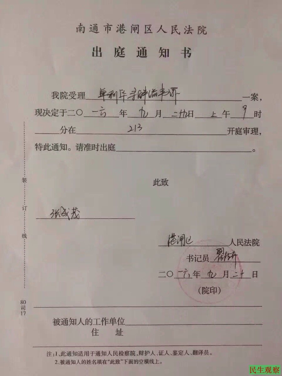 此外南通维权人士单利华寻衅滋事罪一案将于29日早上9点一审宣判,昨日代理律师张成茂已经收到出庭通知书。单利华于2015年11月20日被以涉嫌寻衅滋事罪刑拘,一直关在南通市看守所,该案曾于2016年6月15日、6月27/28日两次在南通市港闸区法院开庭审理,单利华由于长期患病在押期间得不到有效治疗,病情多次发作抢救,该案明日早上9点在南通市港闸区法院一审公开宣判。